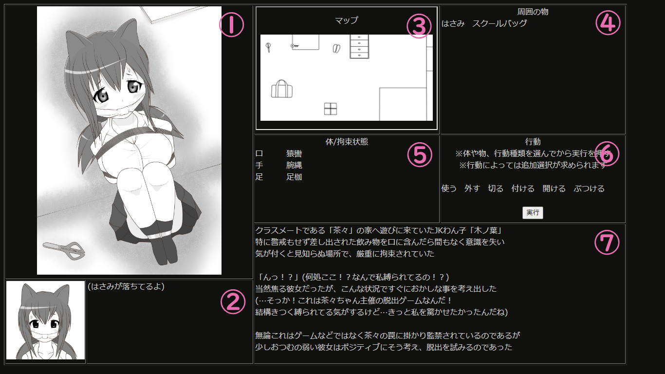 6行動:6つの行動種類から1つを選択します、加えて周囲の物or体/拘束状態を1つ選択し実行を押します